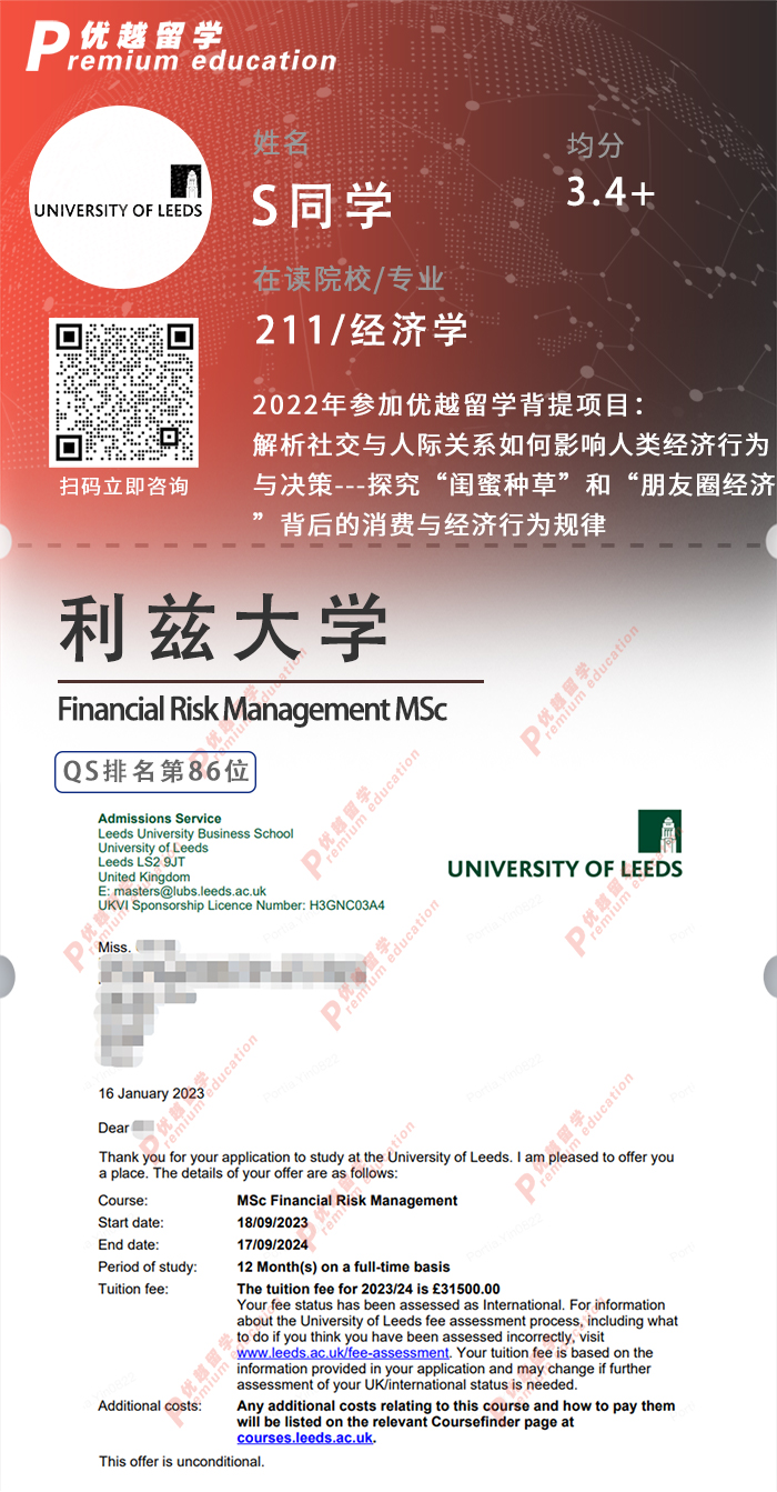 2023offer:恭喜S同學在碩士留學申請中獲得利茲大學金融風險管理碩士通知書。