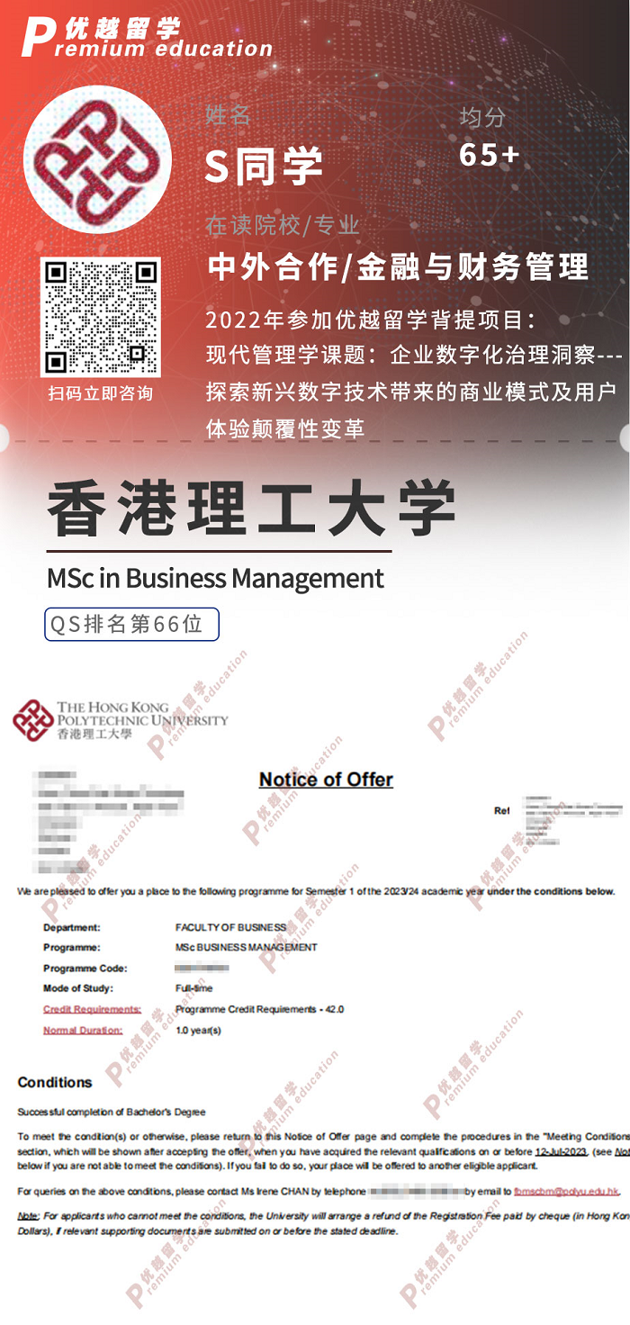2023offer:恭喜S同學在碩士留學申請中獲得香港理工大學商業管理碩士通知書。