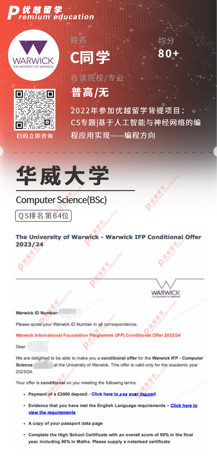 2023offer:恭喜C同學在本科留學申請中獲得華威大學計算機科學專業通知書。