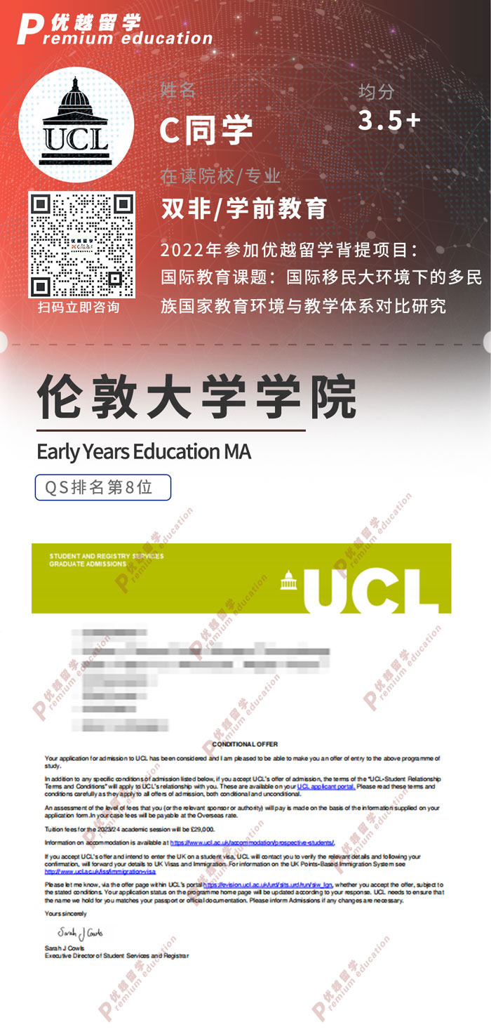 2023offer:恭喜C同學在碩士留學申請中獲得UCL學前教育碩士通知書!