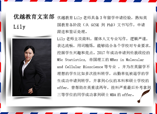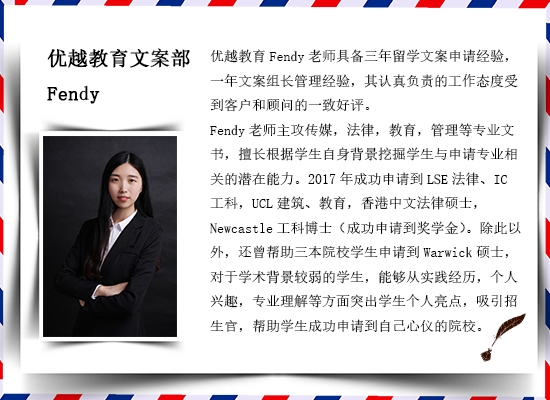 作為一家嚴謹的英國企業,英國優越教育在文書團隊建設和文書材料檢測方面的系統是相當完善的。英國文書團隊由曼徹斯特大學、倫敦大學學院等知名院校語言學專業畢業生組成,中國文書團隊由國內重點大學英語專業畢業英語專業八級以上、雅思寫作7.5以上高素質專業人才組成。盡管每位文書老師都有三年以上行業經驗,進入優越教育以后,也都要經過3個月以上高端文書培訓,經歷過英國G5大學、香港大學、澳洲八大院校等知名院校高水準文書測試后才可以正式開始接文書case,不管在資歷、經驗還是實力上都處于行業較高水準。